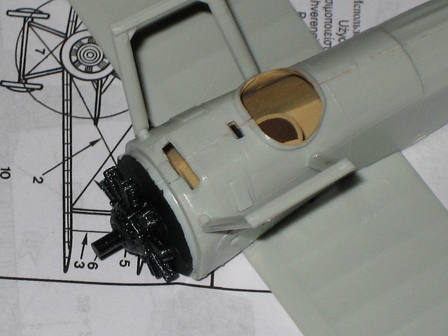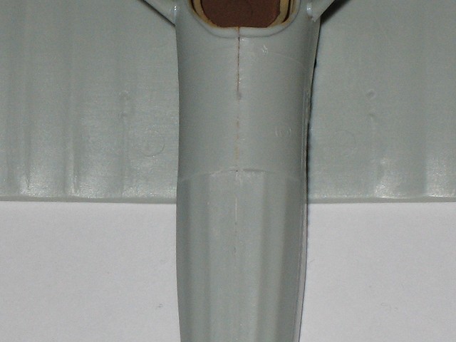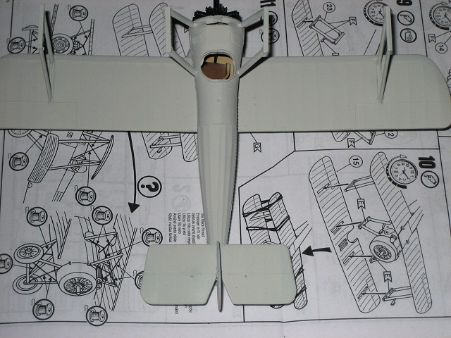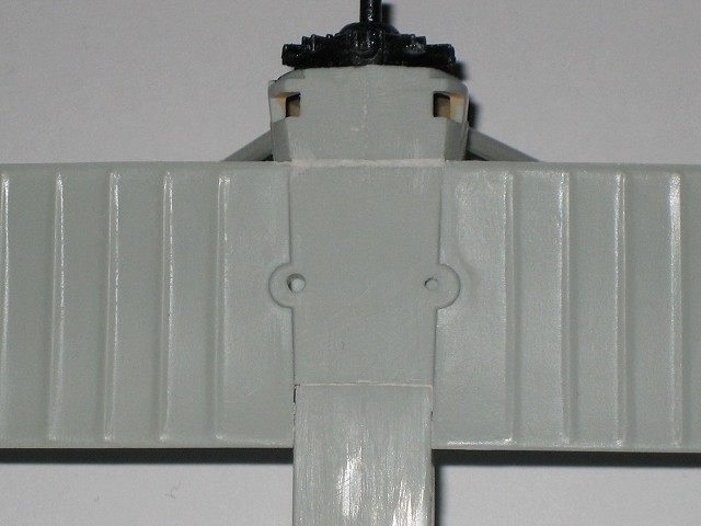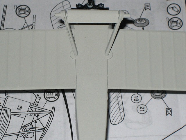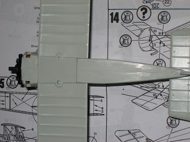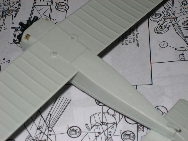 nicht zu verwenden (da ich dachte dass es Gießfehler ist habe ich ihn gleich mal abgeschnitten). Das befestigen der unteren Tragfläche stellt keine Probleme dar. Lediglich der vordere und hintere Spalt zum Rumpf gehören verspachelt. Etwas problematischer wird es hingegen beim befestigen des Leitwerks. Die beiden Teile für Seiten- und Höhenruder sollten gemeinsam am Rumpf angeklebt werden. Dies setzt etwas Geschicklichkeit und richtiges Augenmaß voraus, denn das Seitenruder muss richtig eingerichtet werden damit es mittig und parallel zu den Tragflächen steht. Die Verbindungsstreben für die obere Tragfläche sind laut Bauanleitung zuerst an der unteren Tragfläche zu befestigen. Da diese aber relativ viel Spielraum lassen sollte man sie antrocknen lassen und dann mit der oberen Tragfläche eingerichtet und fixiert werden. Nach dem verspachteln und schleifen sieht das Ergebnis dann so aus. Jetzt nocht kleine Finalisierungsarbeiten und der Rumpf mit unterer Tragfläche und Leitwerk ist soweit fertig für die Grundierung. Nach dem Grundieren sieht man recht schön ob es noch Stellen gibt die ausgebessert werden müssen. Wenn man mit dem Ergebnis zufrieden ist kann es an das lackieren in der eigentlichen Modellfarbe gehen. Die Oberseite der unteren Tragfläche und die Unterseite der oberen Tragläche werde ich vor dem Zusammenbau der Tragflächen lackieren. Im gleichen Zug wird der Rumpf lackiert.
